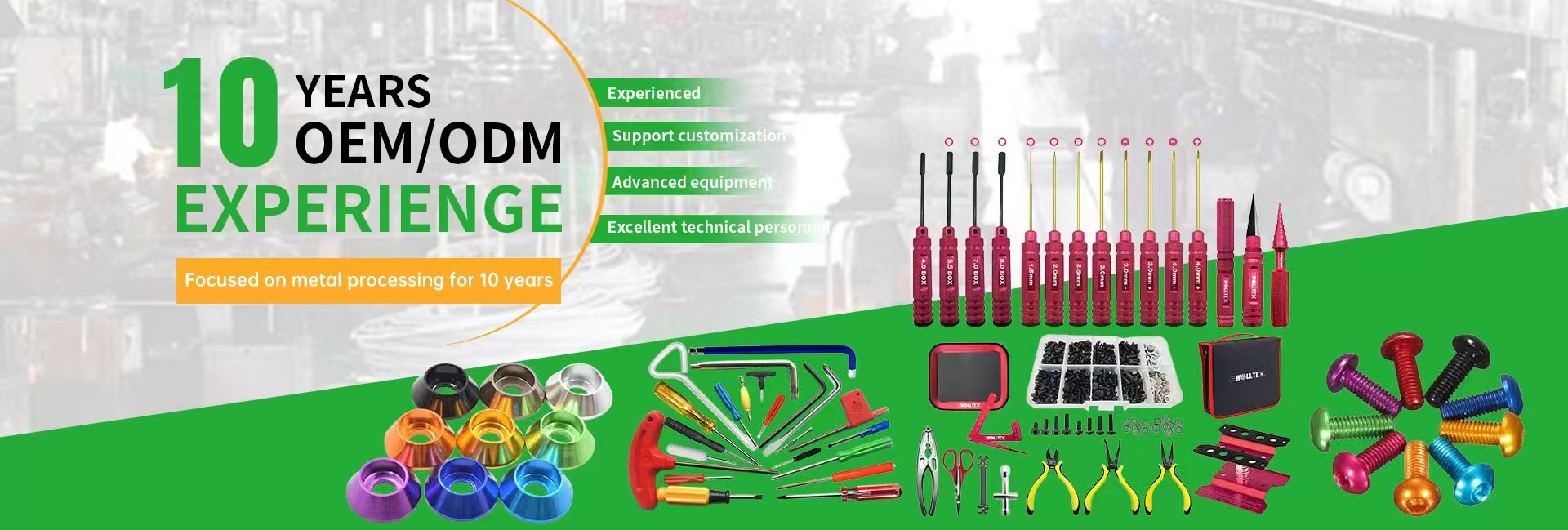 Productos principales:Sujetadores, herramientas manuales, herramientas RC, accesorios RC, mecanizado CNC